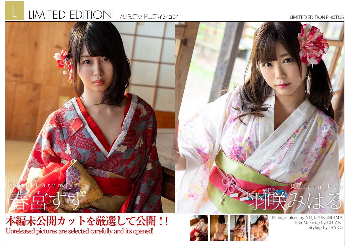 Limited Edition!! Super cute F-cup angels! A special gallery featuring never-before-seen scenes of former Shibuya-kei idol Miharu Usa and big-eyed, G-cup busty beauty Suzu Harumiya in formal wear will be available for a limited time from January 16th to January 29th! Don't miss it!